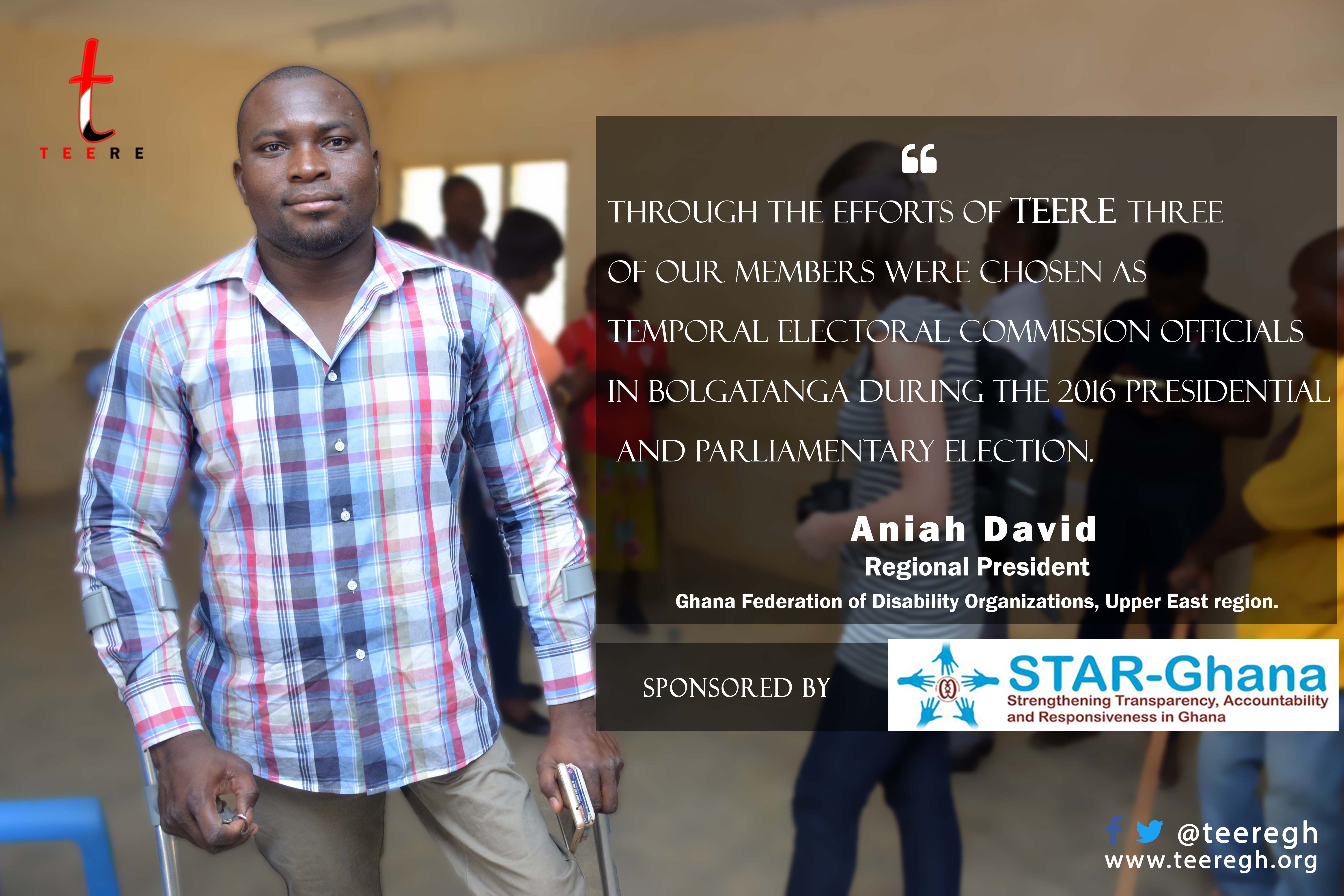 The project dubbed “Mini – Max Campaign 2016” sought to minimize rejected votes and maximize voter turnout with special focus on Persons Living with Disabilities (PWDs), the aged, women, youth, Persons living with AIDS and those living in remote areas. Social exclusion has been a major challenge as such vulnerable groups do not receive significant attention during decision making. Strong democracy can only be achieved when we have all and sundry taking part in the decision making process. Low voter turnout affected the 2012 general election in the Upper East region. Through the support of STAR-Ghana with funding from UKAID, DANIDA and EU, TEERE an NGO in the Upper East Region, implemented a voter education campaign in Bolgatanga and Bongo Districts. The voter education campaign employed various strategies to reach out to the citizenry including door to door sensitisation, community forums (using the local language) radio discussions and announcements. Many communities, social groups and other citizen groups had made up their minds not to vote in the 2016 general election due to underdevelopment and community neglect. The intervention of the TEERE-STAR-Ghana made significant gains in making these citizens change their minds.